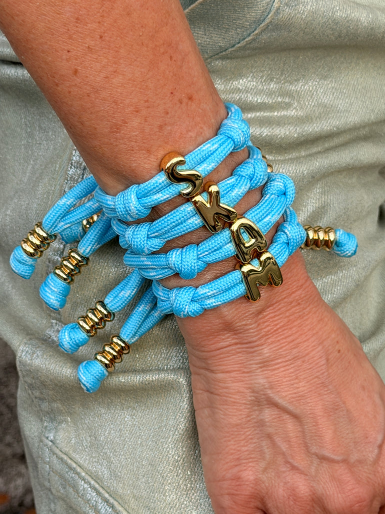 HANDMADE LIGHT BLUE BOLD CORD INITIAL BRACELET-GOLD PLATED LETTER CHARM