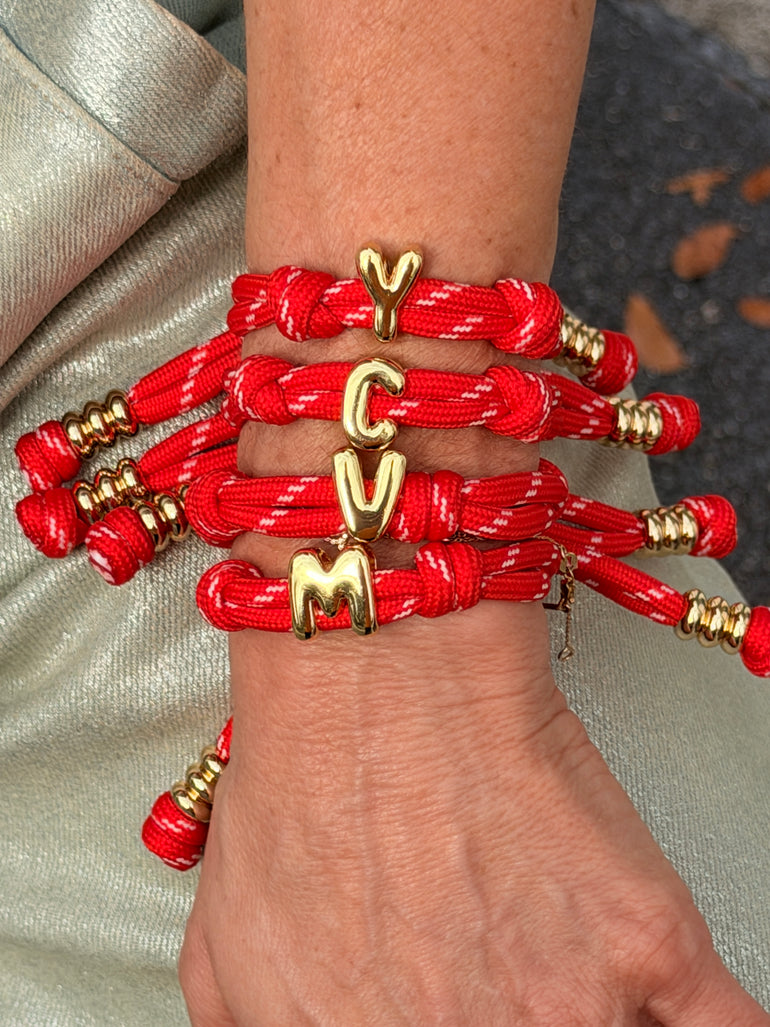Expertly handcrafted with a bold red cord, this bracelet boasts a luxurious gold-plated letter charm. Add a personal touch to any outfit with this unique accessory. Elevate your style and make a statement with this one-of-a-kind piece.