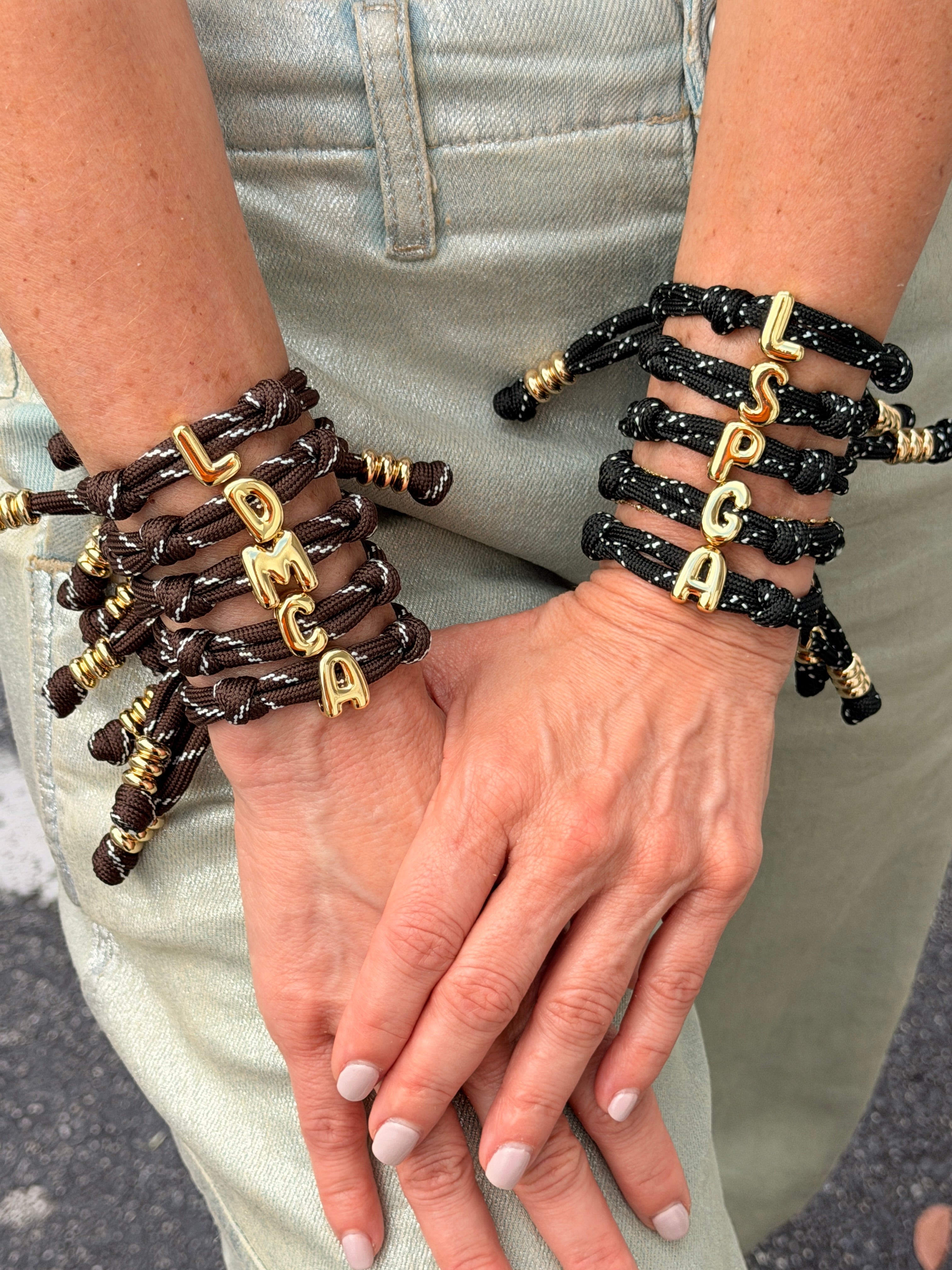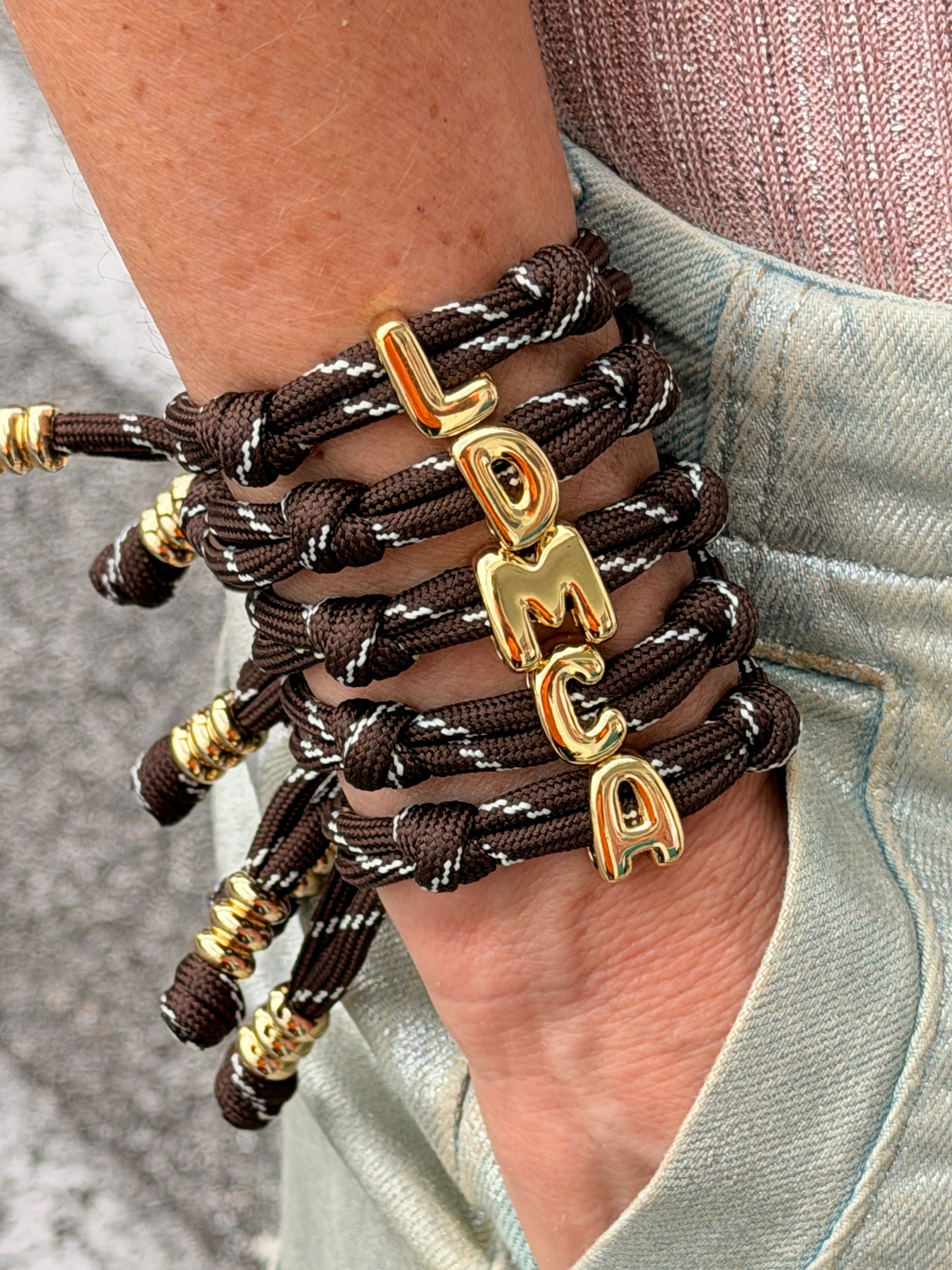 HANDMADE BROWN BOLD CORD INITIAL BRACELET-GOLD PLATED LETTER CHARM