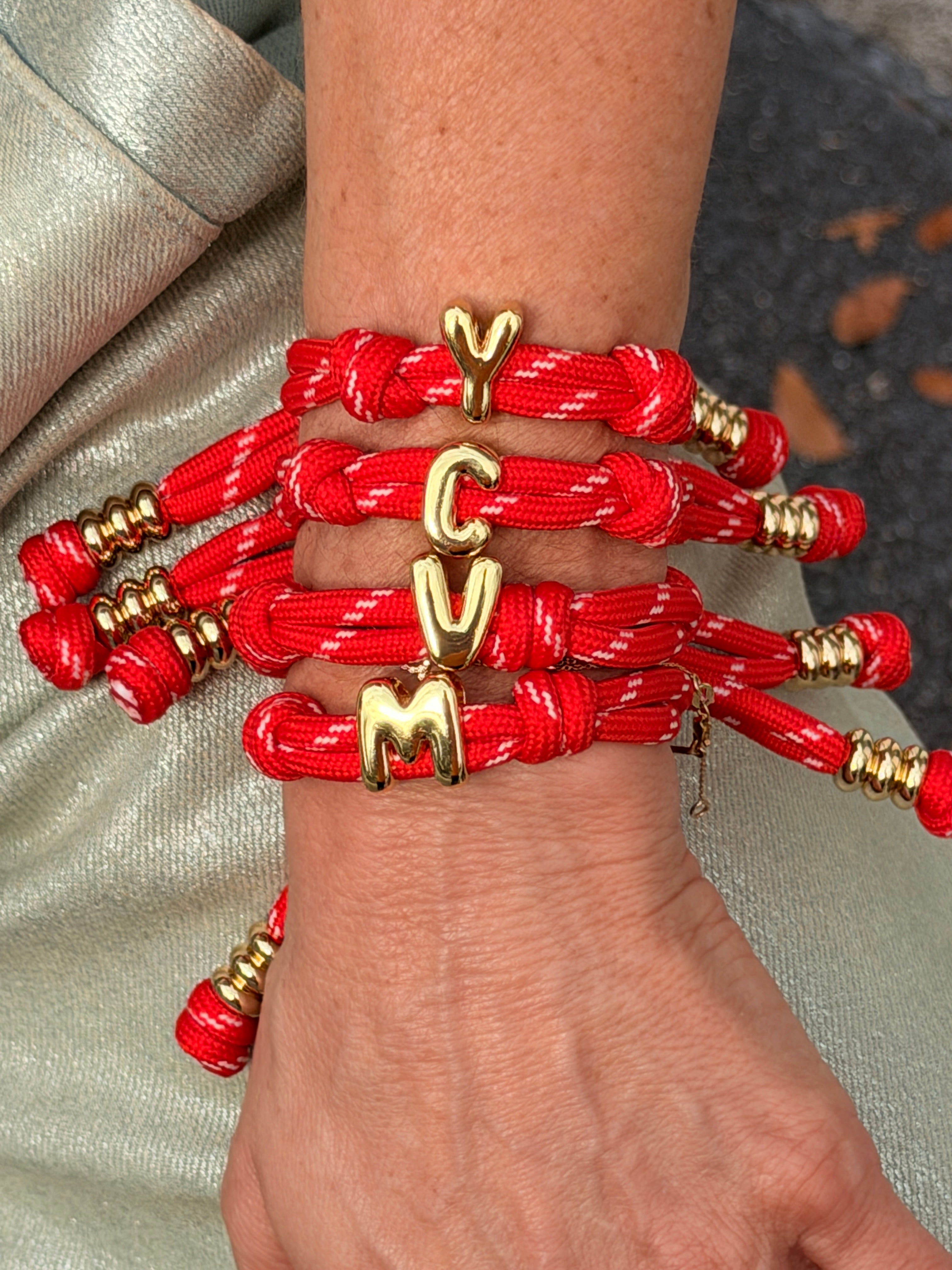 HANDMADE RED BOLD CORD INITIAL BRACELET-GOLD PLATED LETTER CHARM