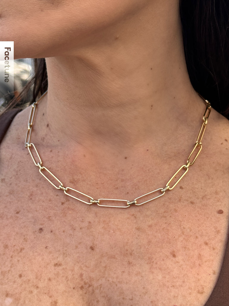 Crafted with high-quality gold filled material, this adjustable chain features a unique paper clip design. Elevate your style with a modern touch, while enjoying the durability and luxury of gold. Perfect for everyday wear or special occasions. Length 16” to 18”