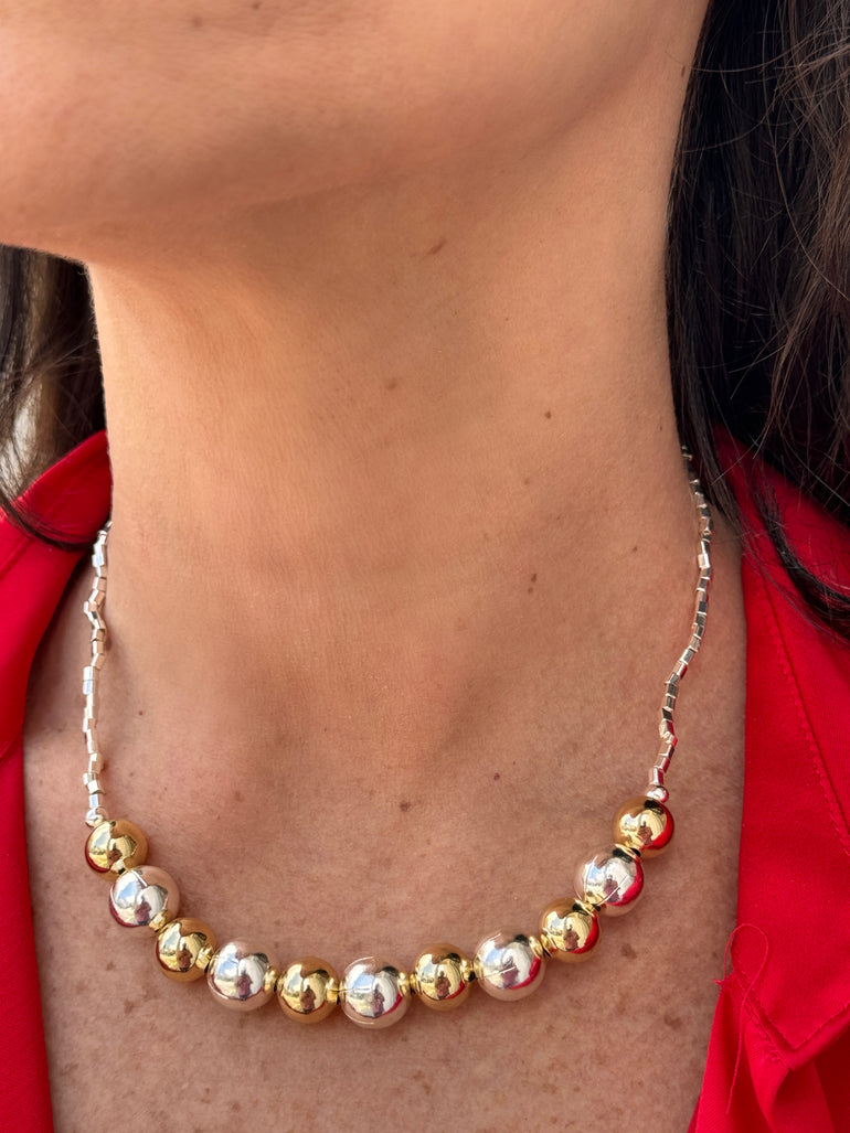 This adjustable necklace is crafted with two tones of gold, featuring gold filled and gold plated beads. A must-have for any jewelry collection, this necklace offers an elegant and versatile look that will complement any outfit. With its adjustable design, it can easily be worn at different lengths for ultimate comfort and style.