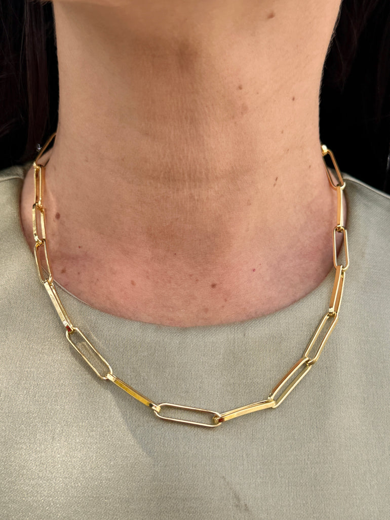 Made from high-quality .925 sterling silver and coated with luxurious gold, this paper clip chain is a unique and stylish addition to any jewelry collection. The adjustable design allows for versatile wearing options, making it a perfect choice for any occasion. Elevate your look with this elegant and modern chain. Length 16”+2”