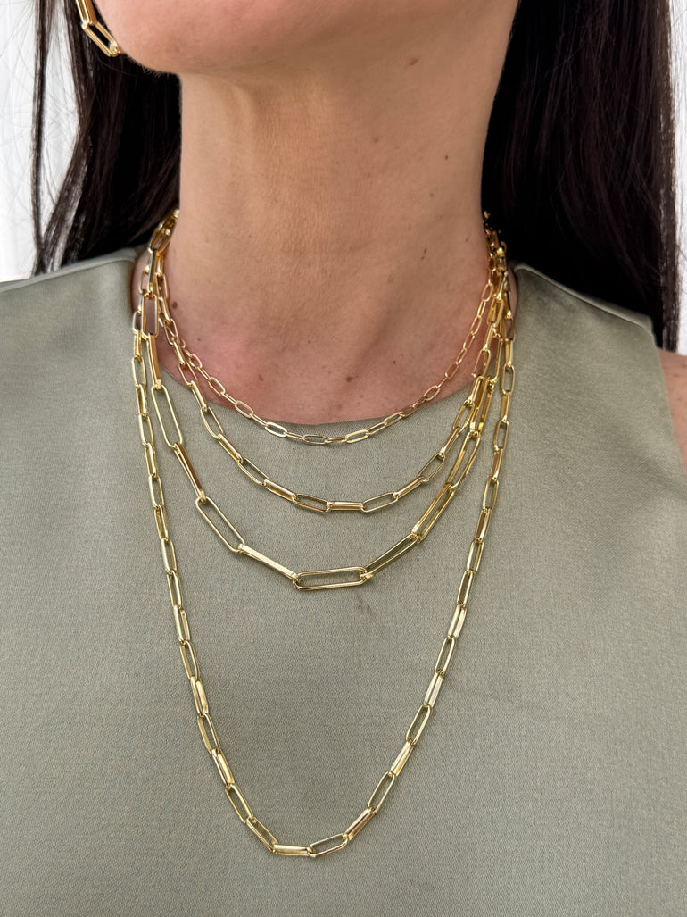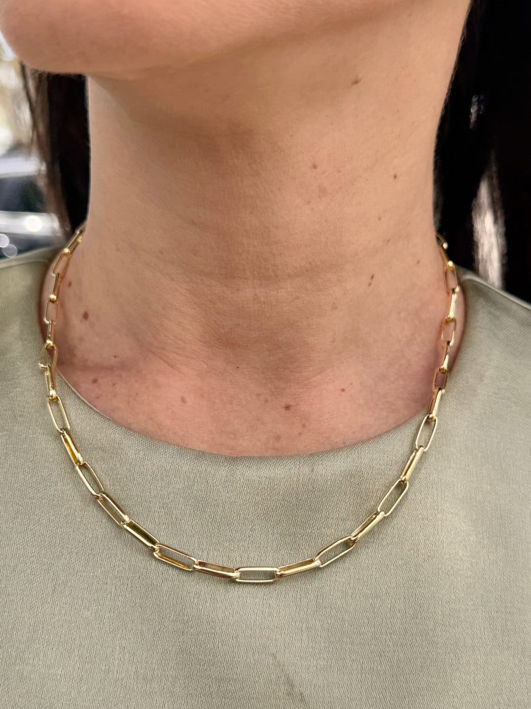 This gold over sterling silver adjustable chain features a medium size paper clip design. Crafted from high quality .925 silver, this chain adds a touch of elegance to any outfit. Additionally, the adjustable length allows for versatile styling options. Elevate your look with this unique and stylish accessory. Length 16”+2”