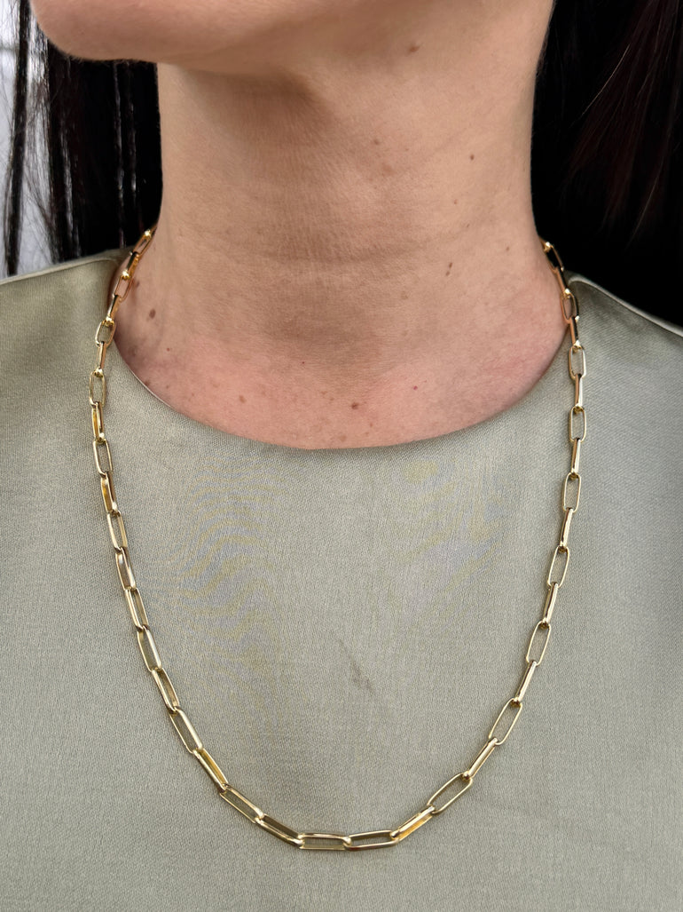 This medium size paper clip chain is crafted from high-quality gold over sterling silver (.925) for a classy and elegant look. The adjustable length makes it versatile and perfect for any outfit. Elevate your style with this sophisticated piece. Length 20”+2”