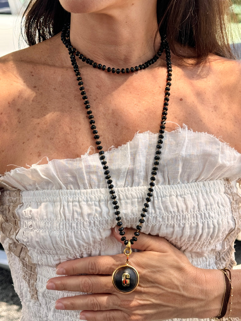 HANDMADE ONIX AND ZAMURO SEEDS WITH THE INITIAL G GOLD PLATED LONG NECKLACE