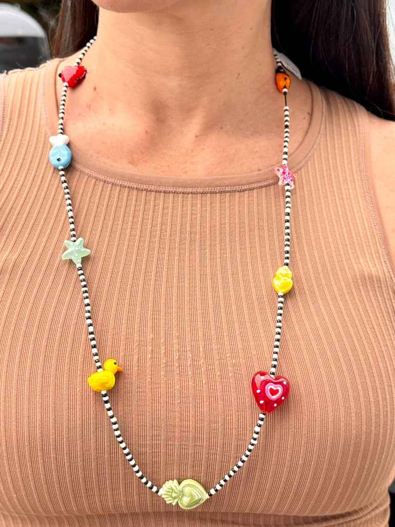 This adjustable long necklace is a stunning addition to any outfit. Each charm is expertly handcrafted from glass, creating a unique and beautiful piece. The vibrant multi-colored charms and green heart add a touch of elegance to your look. Perfect for any occasion, this necklace is sure to make a statement.