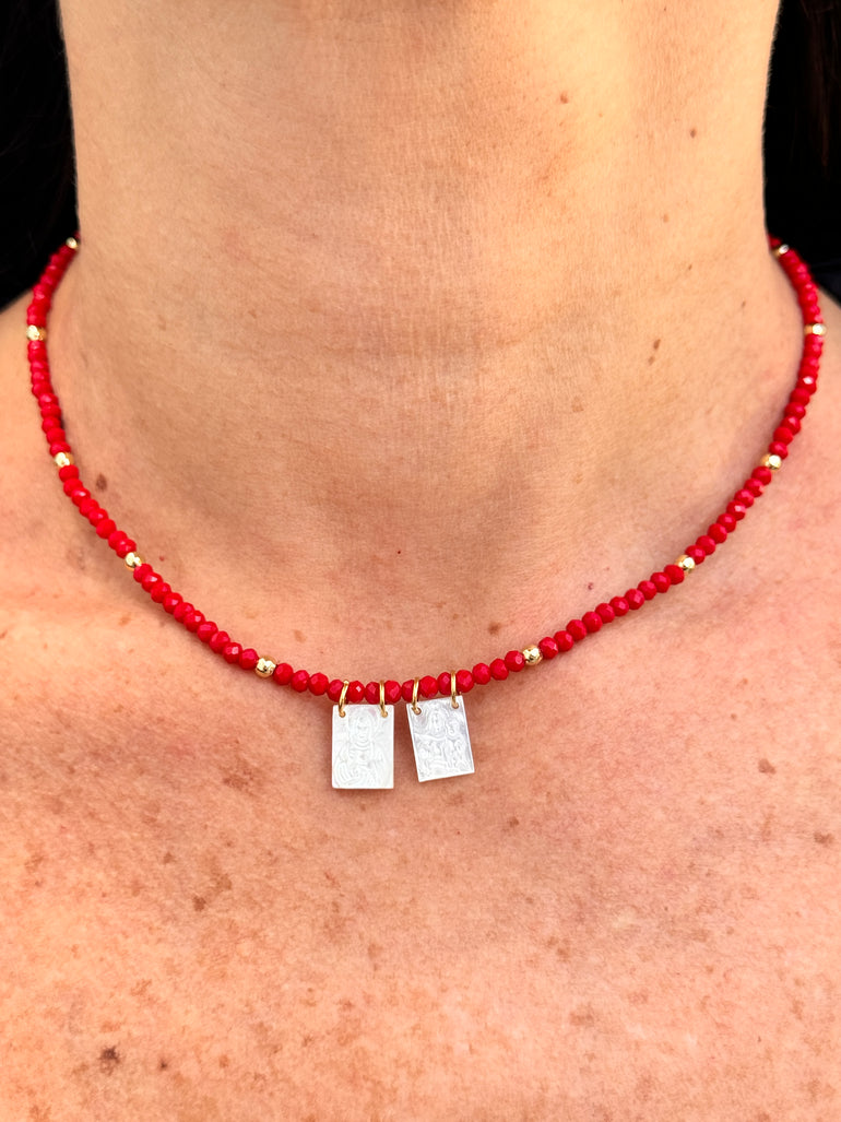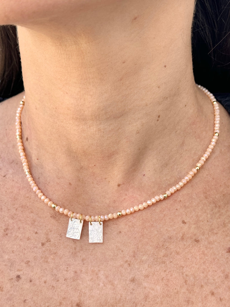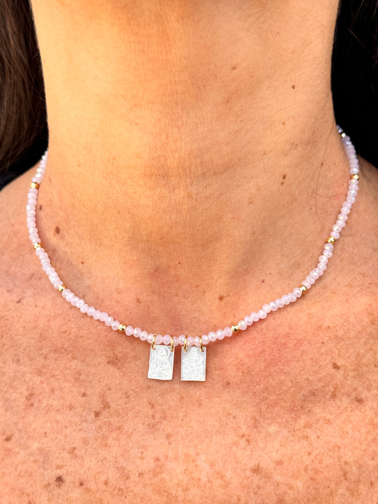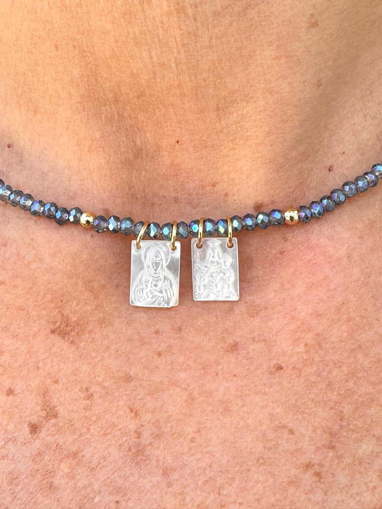 This handmade religious necklace features a stunning combination of mother of pearl and crystals, set in a gold-plated adjustable chain. The perfect accessory to add a touch of elegance and spirituality to any outfit. Diameter Crystals: 3mm. Length: 16" to 18"