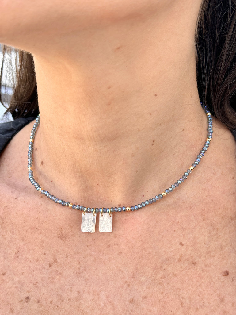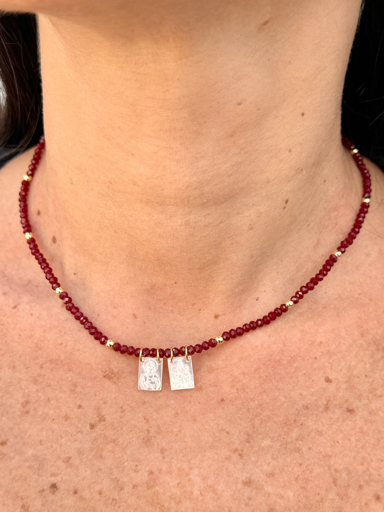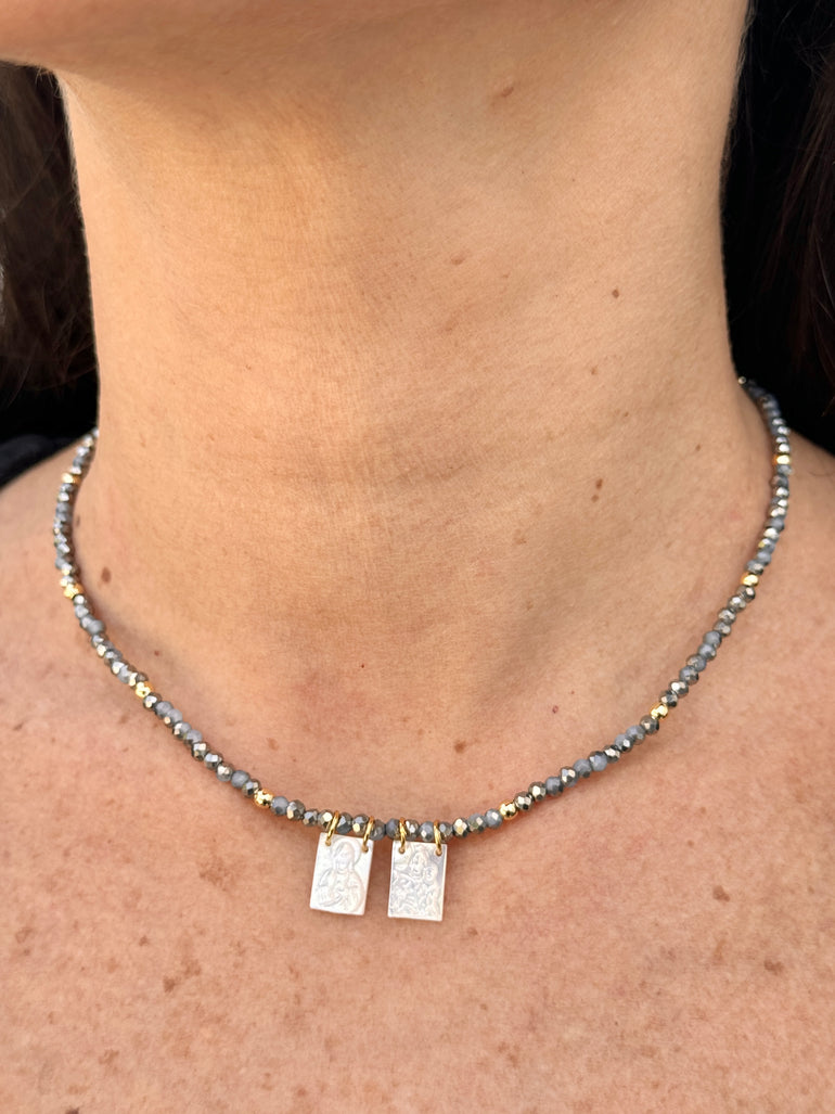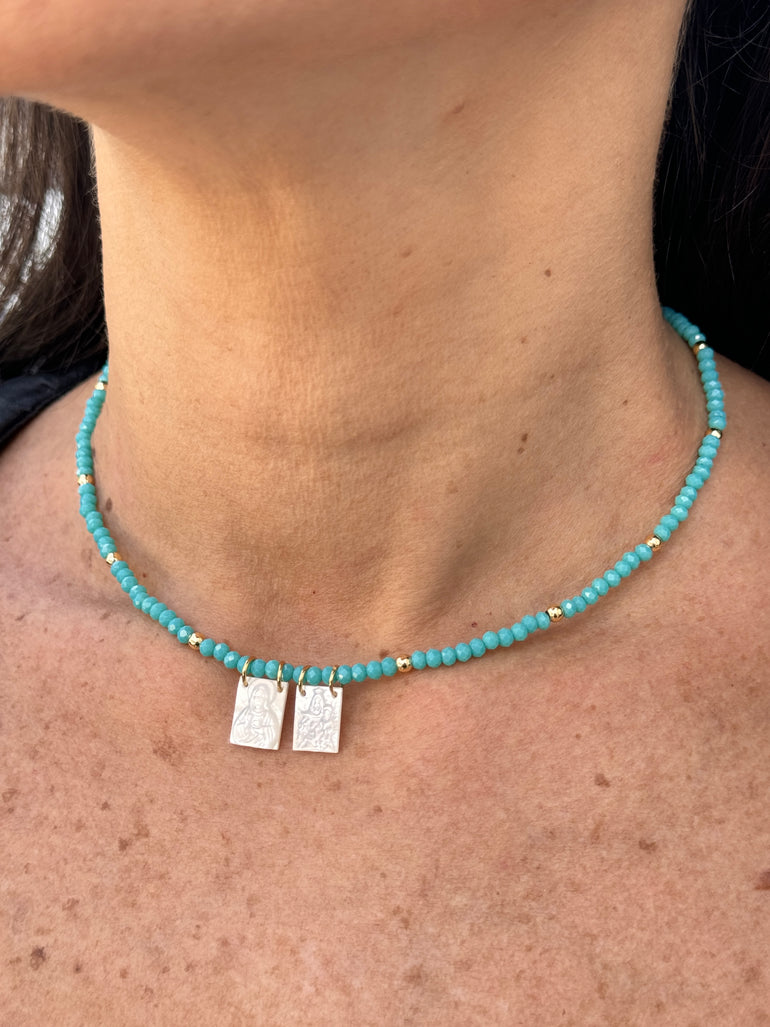 This handmade religious necklace features a stunning combination of mother of pearl and crystals, set in a gold-plated adjustable chain. The perfect accessory to add a touch of elegance and spirituality to any outfit. Diameter Crystals: 3mm. Length: 16" to 18"