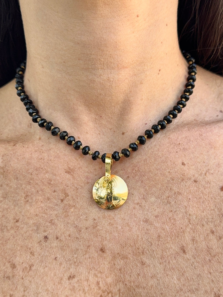 This expertly crafted and unique necklace features a delicate handmade pendant of the Virgin of Chiquinquira and luxurious gold plated onix. Bring elegance and spirituality to any outfit with this stunning accessory. Length 16”