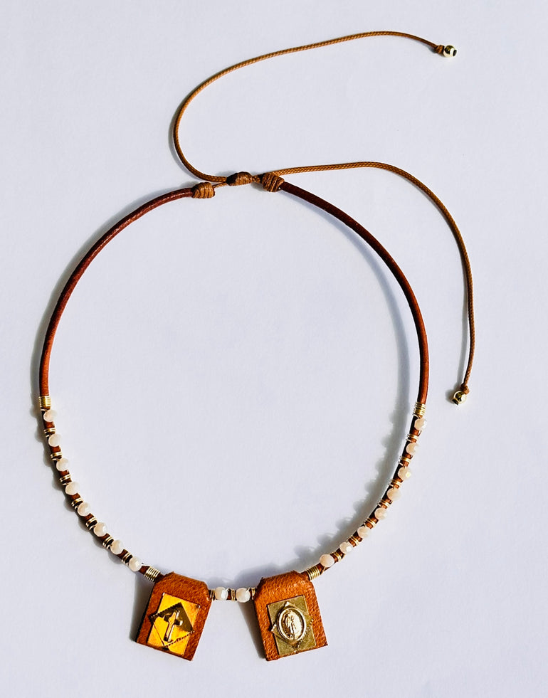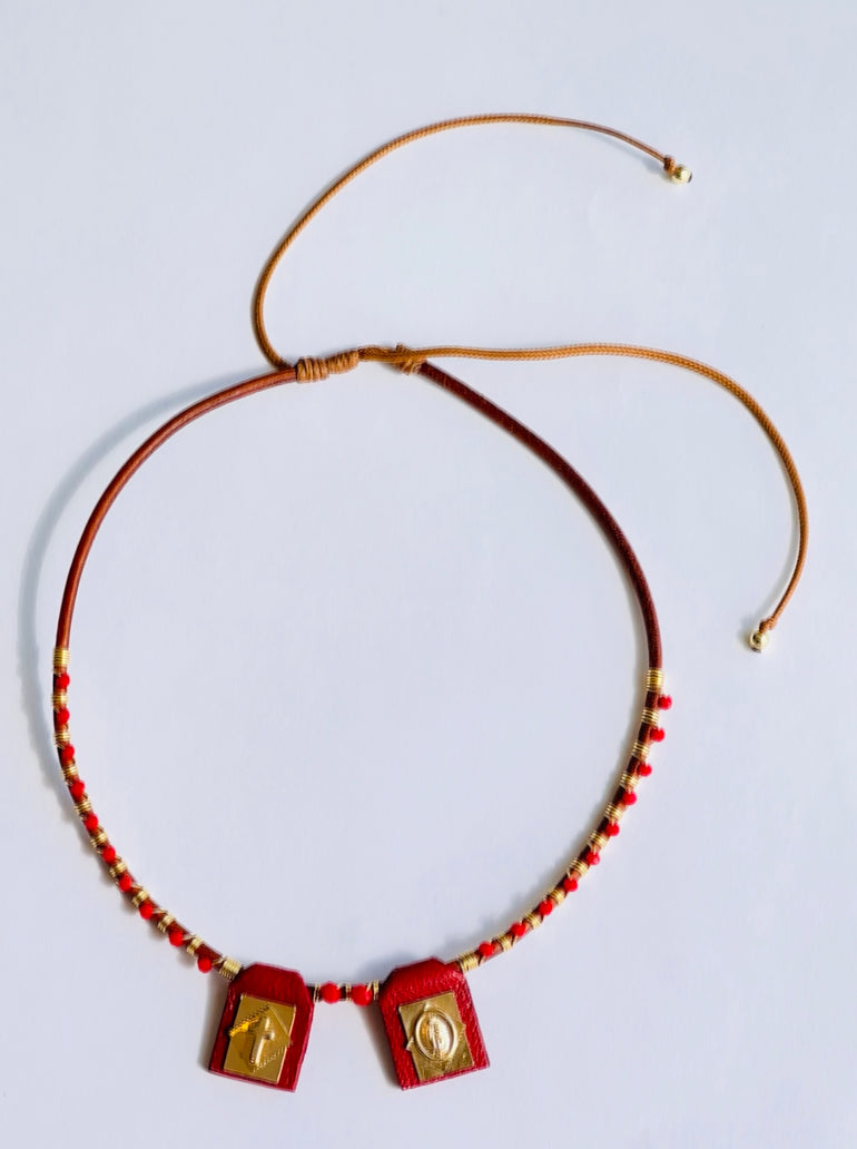 HANDMADE RELIGIOUS RED LEATHER GOLD PLATED NECKLACE