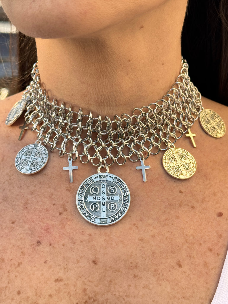 HANDMADE STAINLESS STEEL SAINT BENEDICT MULTI CHARMS ADJUSTABLE CHOKER