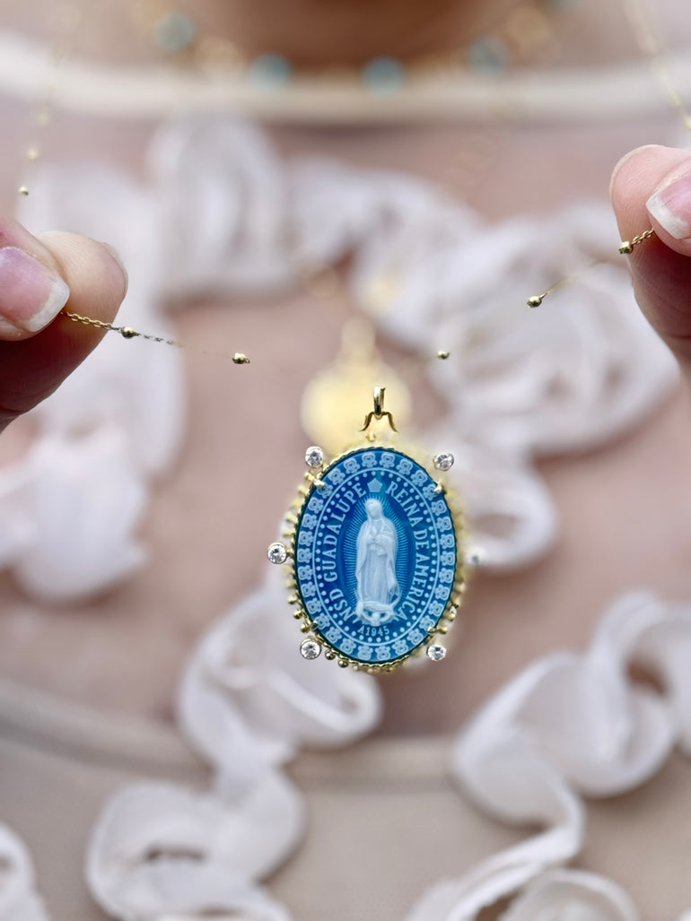 This sterling silver necklace features a beautifully crafted cameo of Our Lady of Guadalupe, accented with a rosary-style gold plating. Elegant and meaningful, this piece serves as a constant reminder of faith and devotion. A timeless and precious addition to any jewelry collection.