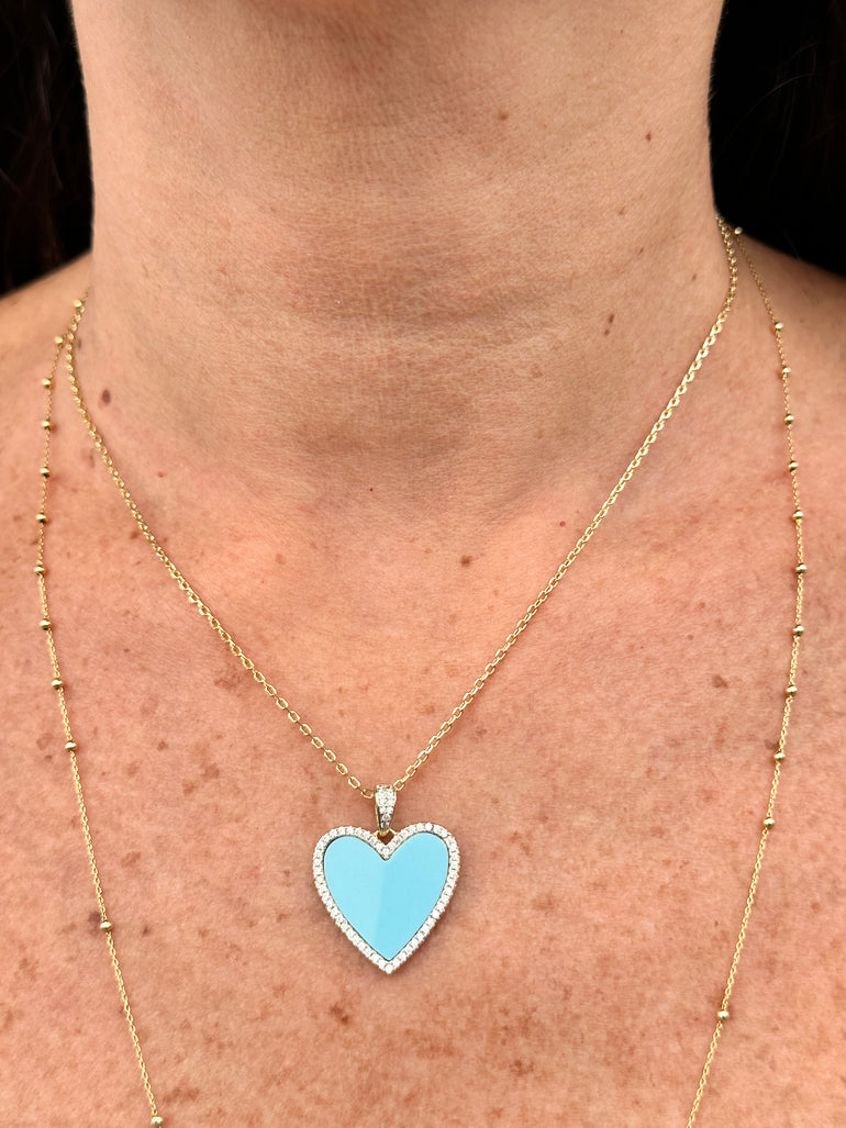 This classic necklace offers the elegance of Sterling Silver accented with a 16mm Turquoise heart and Gold plated chain. The combination of rustic Turquoise with gleaming Gold makes it perfect for any occasion. Size 16” to 18”