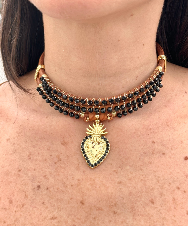 HANDMADE LEATHER & BLACK CRYSTALS GOLD PLATED ADJUSTABLE NECKLACE