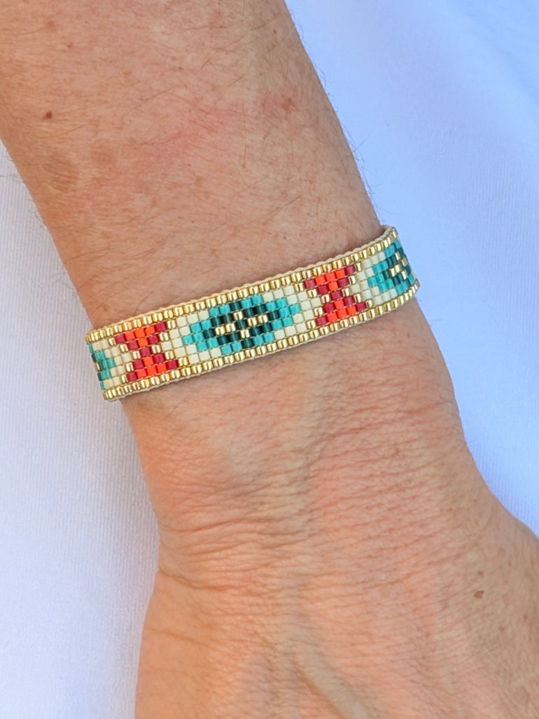 The Handmade Miyuki Adjustable Gold Bracelet features meticulously crafted Miyuki beads, known for their precision and durability. The adjustable design ensures a comfortable fit for various wrist sizes, making it suitable for everyday wear. This elegant accessory combines traditional craftsmanship with modern versatility.
