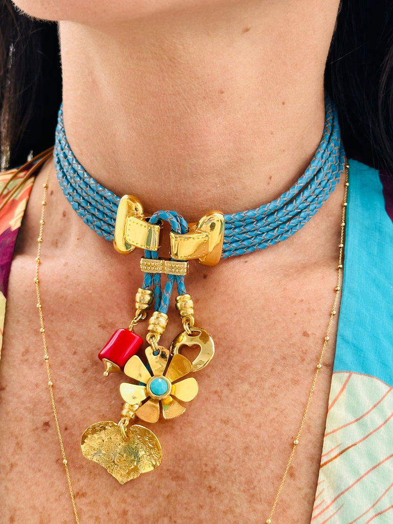 HANDMADE BLUE LEATHER HEART MULTI CHARMS GOLD PLATED NECKLACE