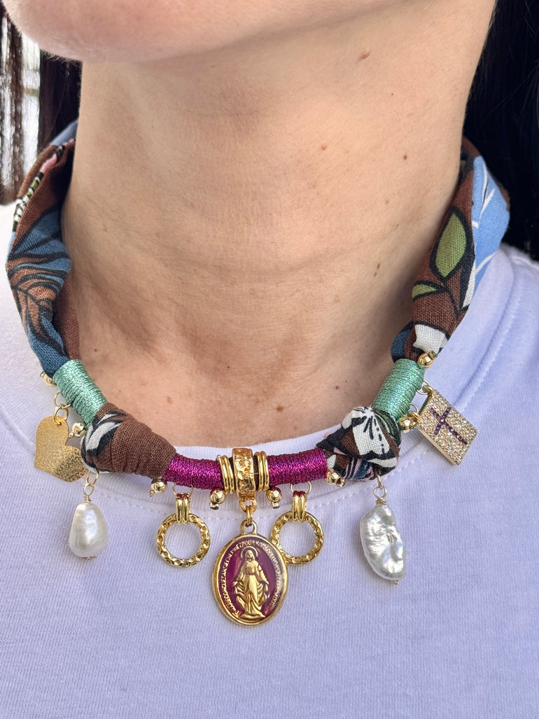 HANDMADE FUCSIA PENDANT AND FABRIC ADJUSTABLE GOLD PLATED NECKLACE