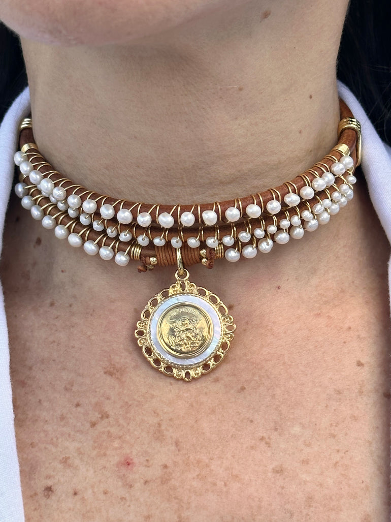 HANDMADE LEATHER RELIGIOUS SAINT MICHAEL ADJUSTABLE CHOKER