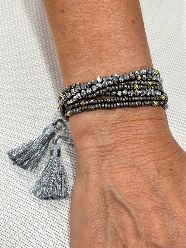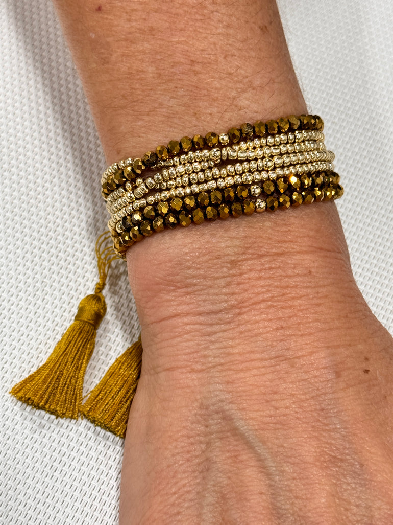 Expertly crafted with handmade crystals, this multi-line adjustable bracelet is a must-have for any jewelry collection. The stunning design and precise attention to detail make this bracelet a timeless and versatile accessory. Elevate any outfit with the beauty and elegance of these crystals.