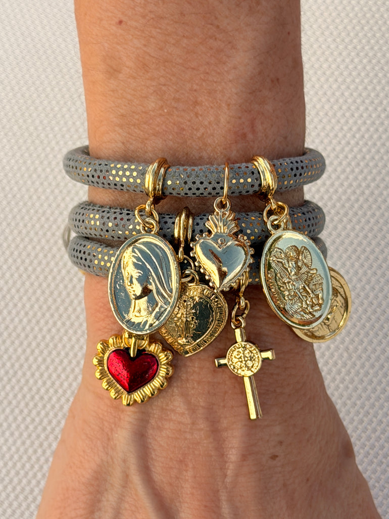 HANDMADE RELIGIOUS MULTI CHARMS TWO TONES GOLD PLATED BRACELET SET