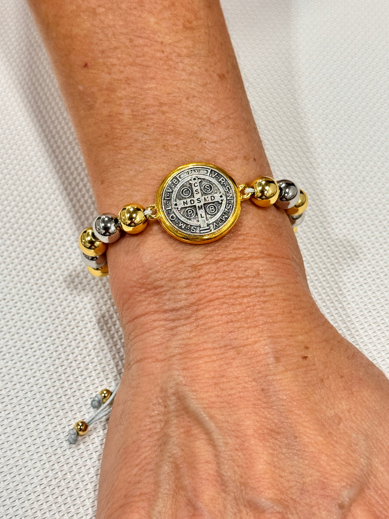 This handmade religious bracelet features an adjustable, two-tone design with a gold-plated finish. Perfect for daily wear or special occasions, it adds a touch of elegance to any outfit. Its unique design and high-quality craftsmanship make it a must-have accessory for any jewelry lover.
