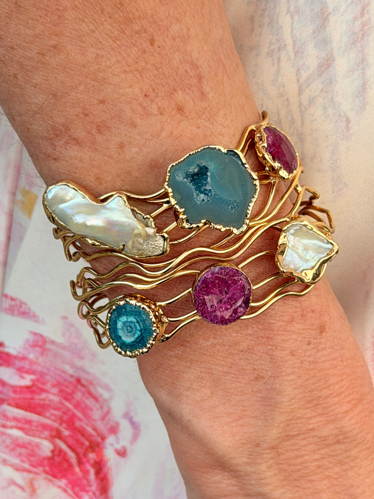Expertly crafted with handpicked semi precious stones, this adjustable gold plated bangle is a stunning addition to any outfit. The unique handmade design adds a touch of elegance and sophistication. Experience the luxurious benefits of wearing this one-of-a-kind piece.
