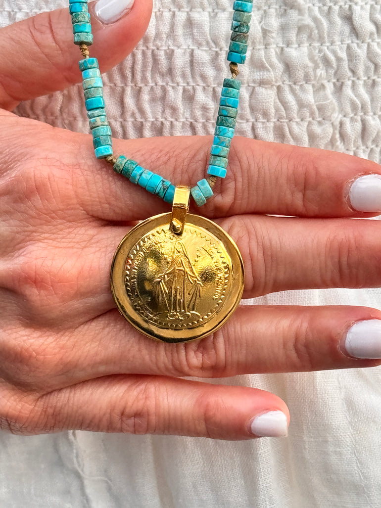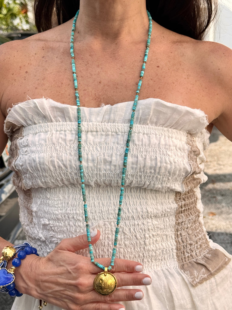 Expertly handcrafted with stunning semi precious turquoise stones, this gold-plated long necklace exudes both religious and stylish vibes. Elevate any outfit with its unique design and bring positive energy with you wherever you go. Perfect for anyone seeking a touch of spirituality in their fashion. 36”