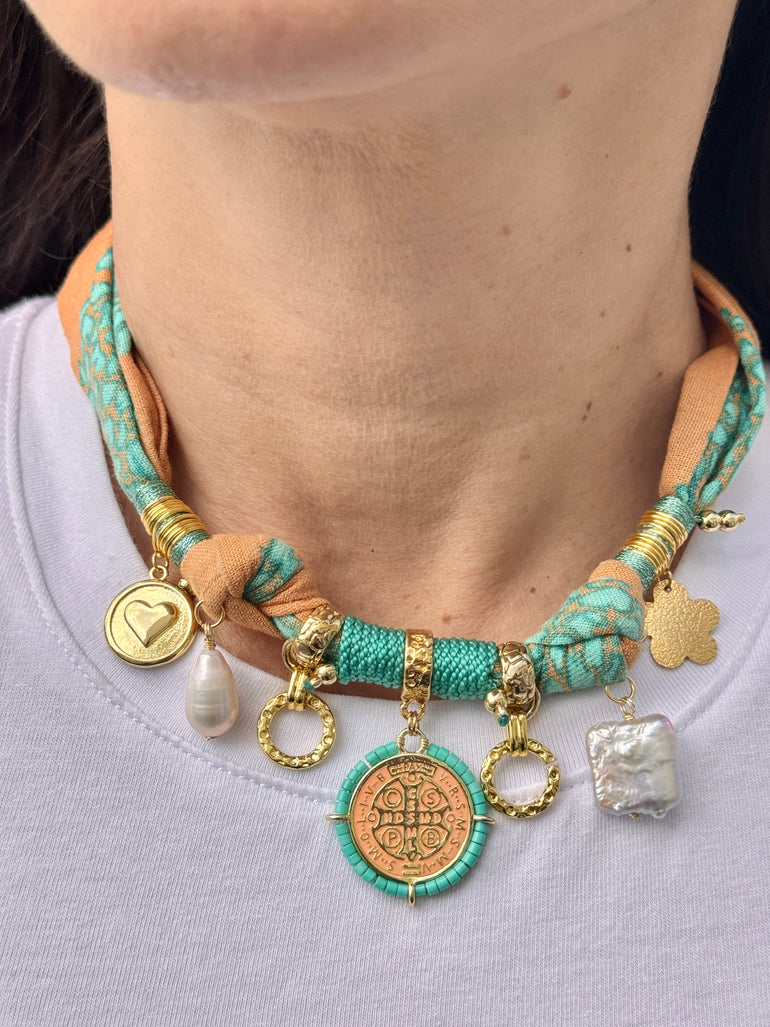 HANDMADE TURQUOISE FABRIC ADJUSTABLE GOLD PLATED NECKLACE