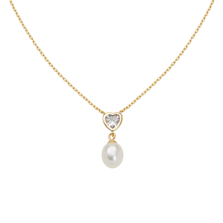 STERLING SILVER HEART & WATER PEARL CZ PENDANT GOLD PLATED NECKLACE