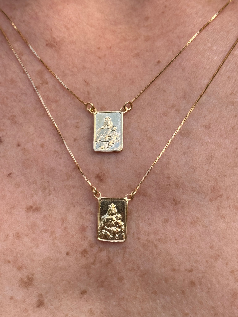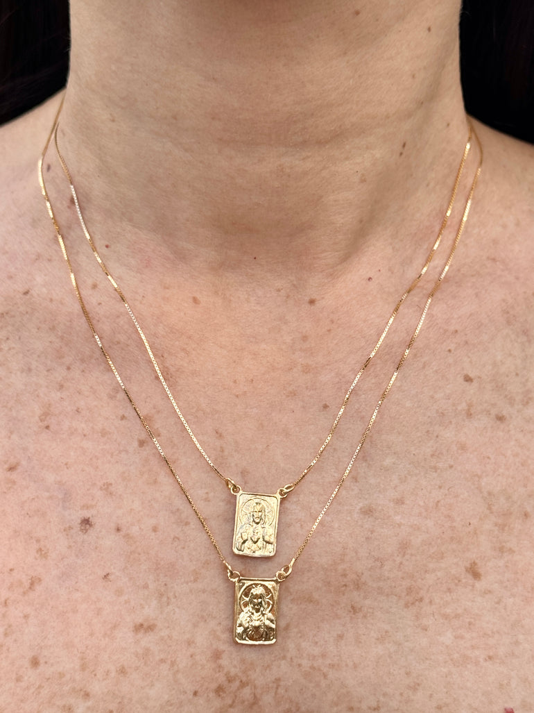 Crafted from high-quality sterling silver and gold plated for a timeless shine, this adjustable necklace boasts a traditional scapular design. Perfect for daily wear, this necklace will add a touch of elegance to any outfit while also serving as a meaningful symbol of faith.