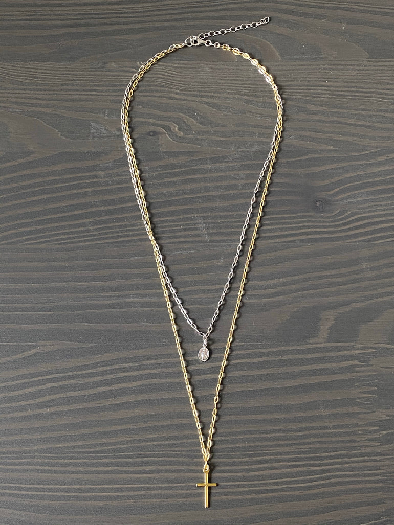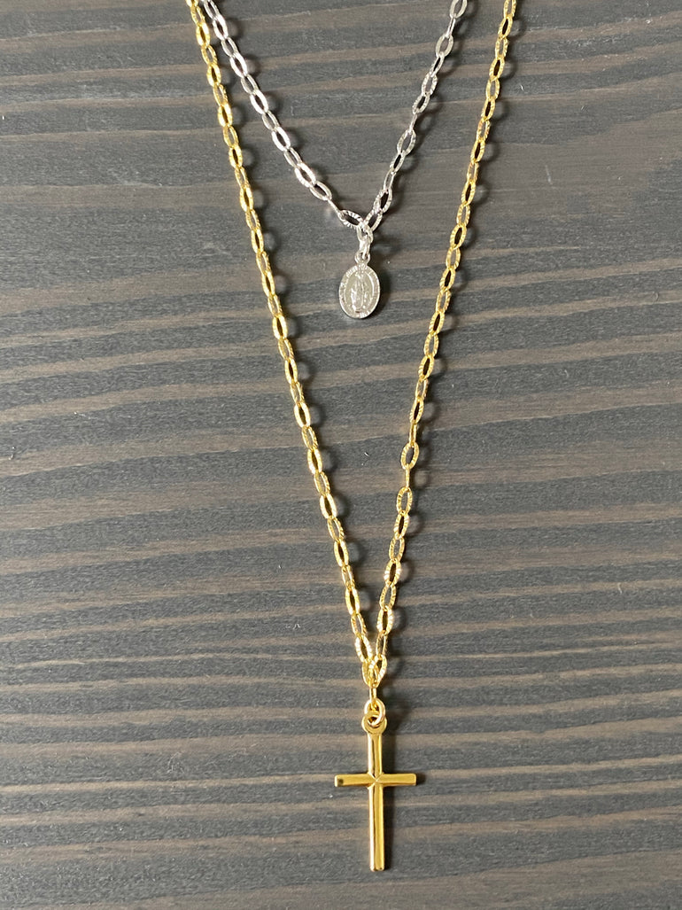STERLING SILVER TWO TONES RELIGIOUS PAPERCLIP GOLD PLATED NECKLACE