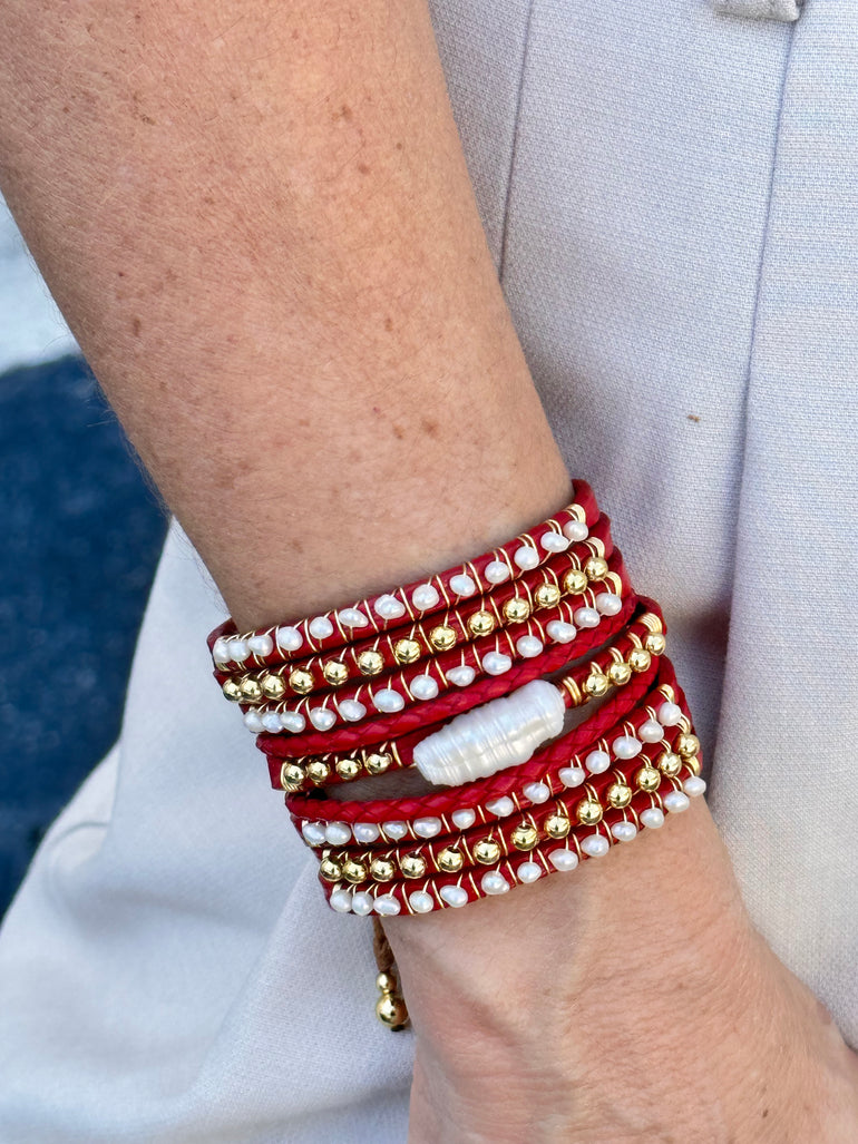 HANDMADE LEATHER MULTI LINES WATER PEARL ADJUSTABLE BRACELET